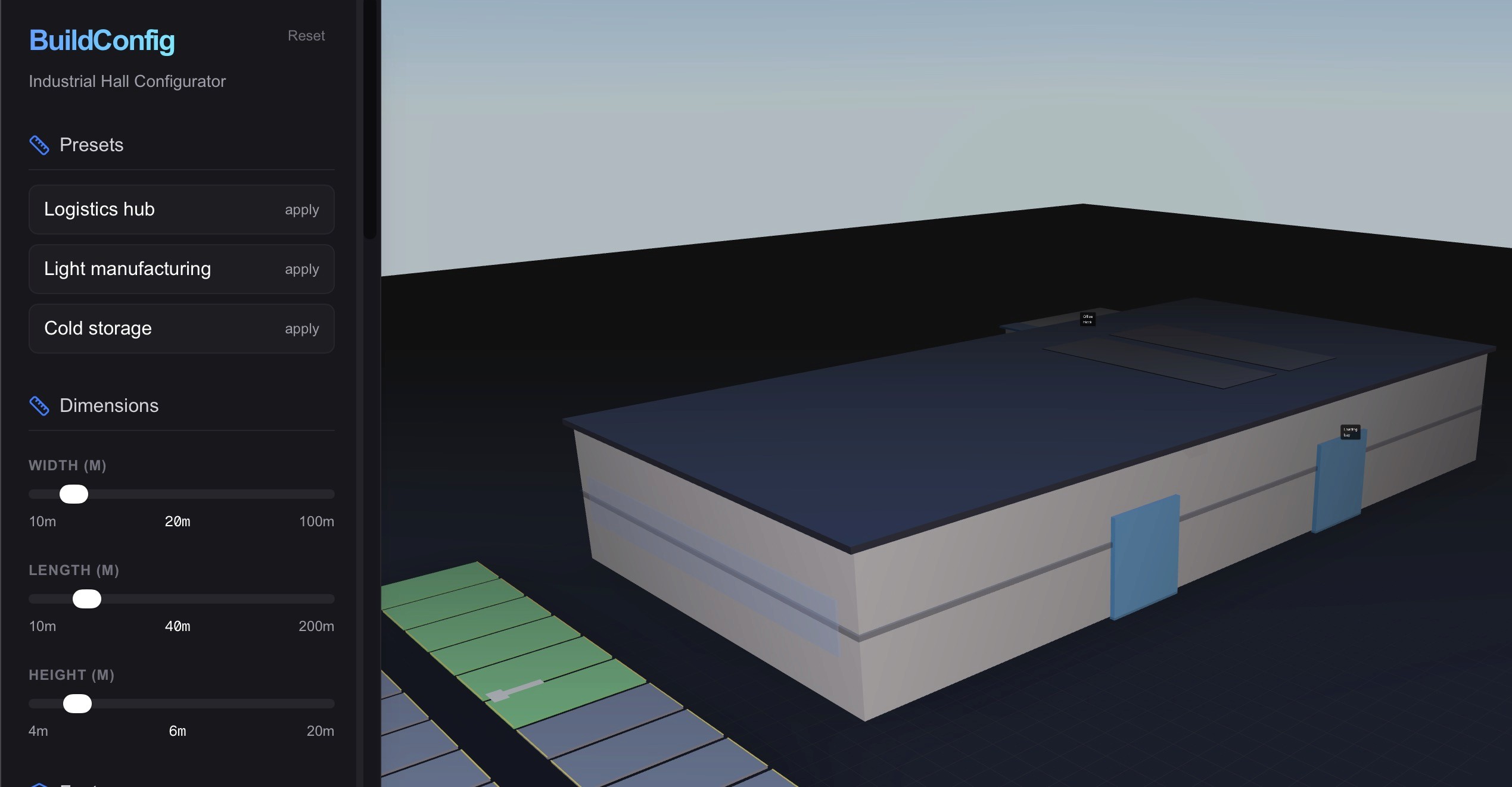Kokeile Green Parkin helppokäyttöistä ja interaktiivista suunnittelutyökalua. Määritä hallin mitat, valitse haluamasi varustelutaso ja muokkaa kokonaisuutta tarpeidesi mukaan. Työkalu laskee rakennuskustannusten hinta-arvion välittömästi valintojesi perusteella. Voit suunnitella rauhassa – ilman odottelua tai sitoumuksia.